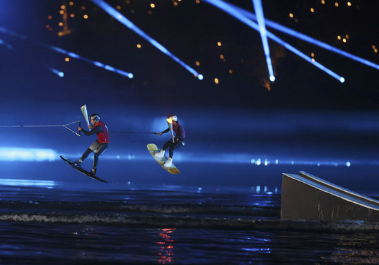 開幕式接近尾聲,中國滑水運動員以滑水的方式疾馳于湖上,共同點燃主火炬,水火交相輝映,現場再次沸騰。