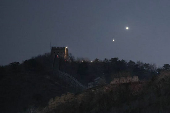 2023年3月2日,在北京懷柔區水長城拍攝的金(右上)木(左下)極近。(周博 攝)