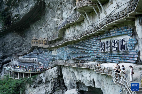 8月9日,游客在廣西河池市羅城仫佬族自治縣棉花天坑景區內的懸崖書店游玩。