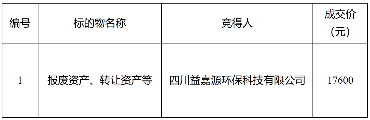 經(jīng)綿陽市財(cái)政局批準(zhǔn),我中心于2025年8月8日在全國(guó)公共資源交易服務(wù)平臺(tái)(四川省•綿陽市)電子交易系統(tǒng)網(wǎng)上競(jìng)價(jià)方式公開處置“報(bào)廢資產(chǎn)、轉(zhuǎn)讓資產(chǎn)等固定資產(chǎn)”一批,現(xiàn)將成交結(jié)果公示如下: