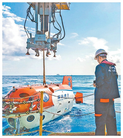 “深海勇士”號載人深潛器布放(資料照片)。國家文物局供圖(新華社發)