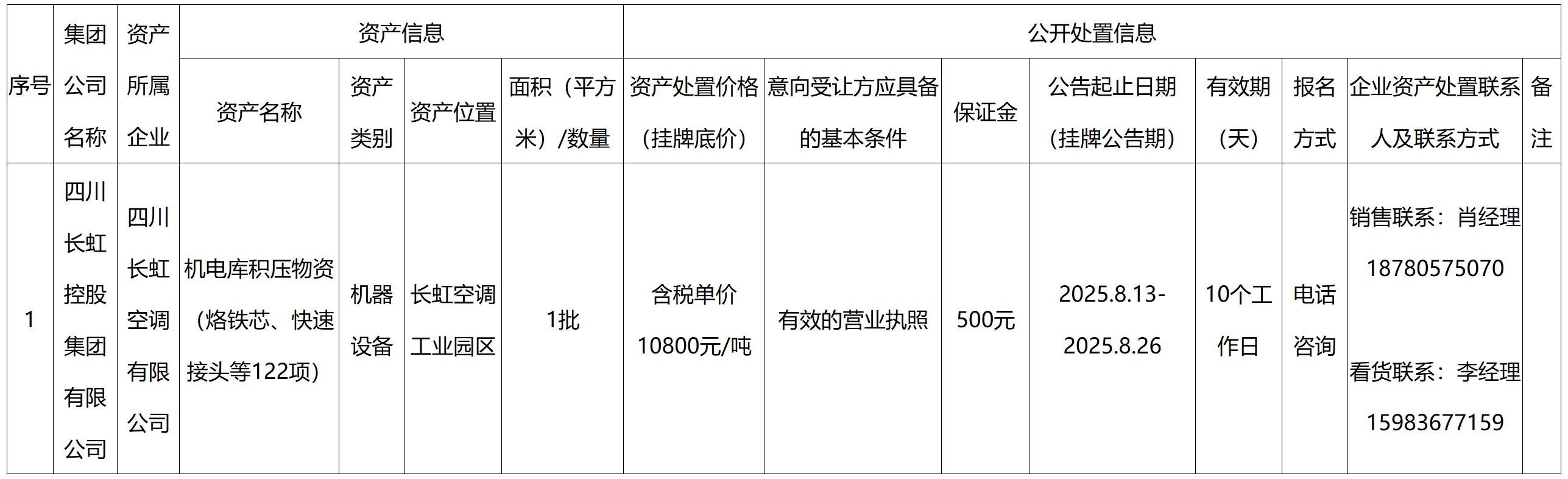 四川長虹空調有限公司企業資產處置公告