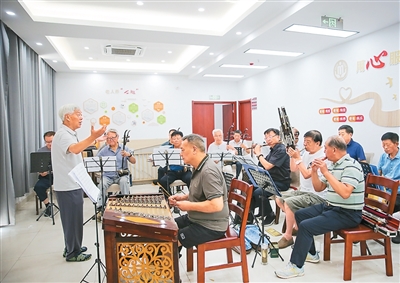 近年來,江蘇省如皋市東陳鎮萬富社區依托居家養老服務站,組織老年群體開展各類文娛活動,不斷提升老年群體的幸福感和獲得感。圖為老年民樂隊隊員在該社區居家養老服務站排練節目。