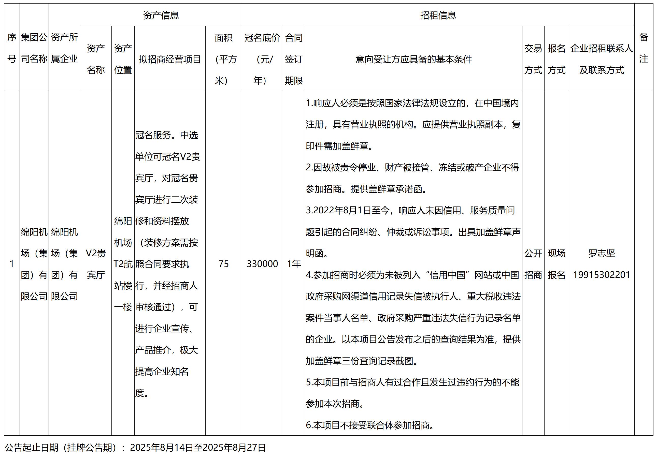 綿陽機場(集團)有限公司貴賓廳冠名招商公告