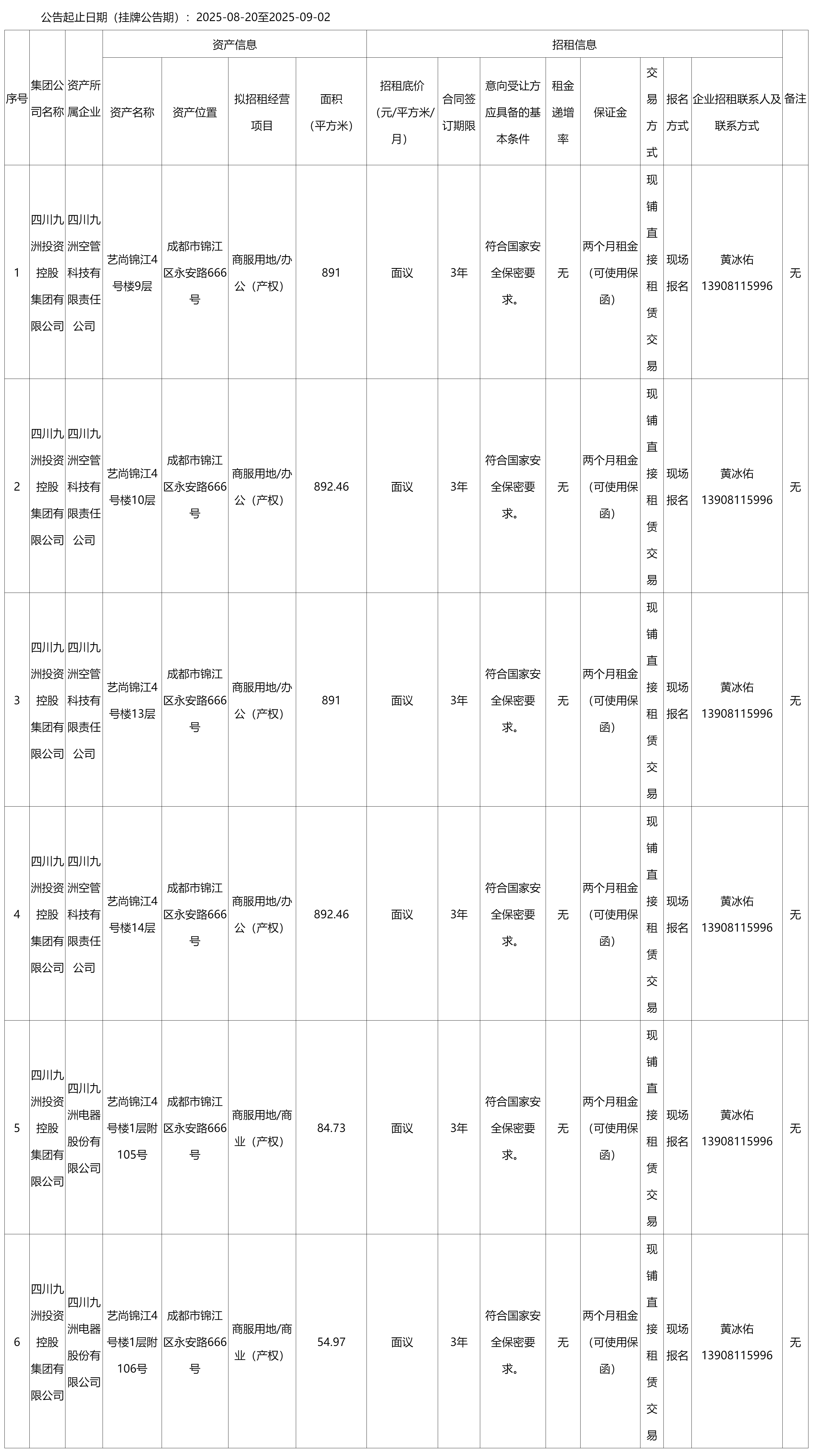 四川九洲千城商業管理有限公司成都項目(藝尚錦江1F、9F、10F、13F、14F)辦公/商鋪出租公告