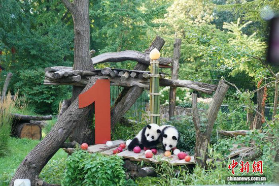 當地時間8月22日,旅德大熊貓雙胞胎“夢好”和“夢甜”在柏林動物園歡度一周歲生日。圖為“夢好”和“夢甜”依偎在竹子生日蠟燭前。中新社記者 馬秀秀 攝