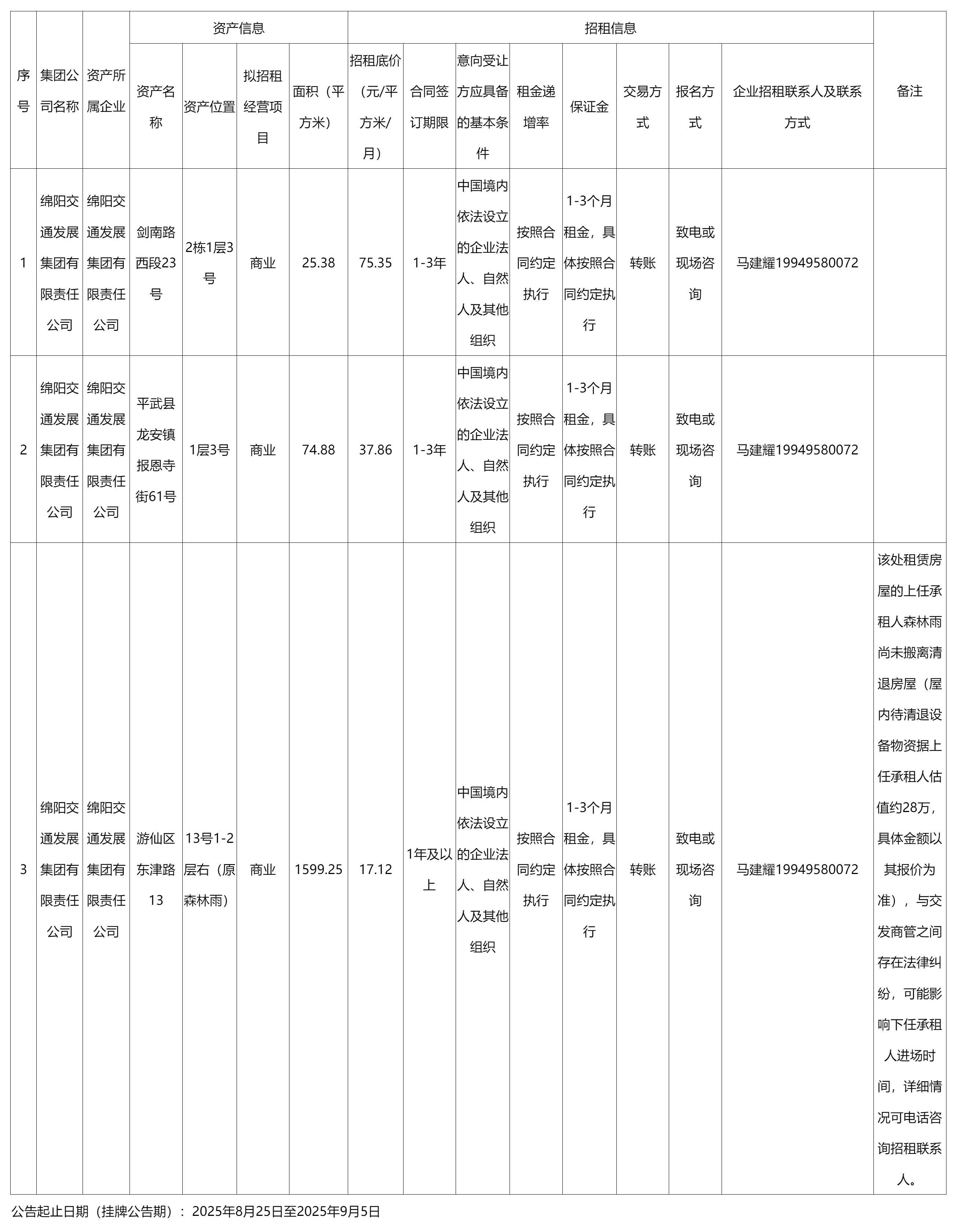 綿陽交發(fā)實(shí)業(yè)有限責(zé)任公司涪城區(qū)、游仙區(qū)與平武縣部分資產(chǎn)招租公告