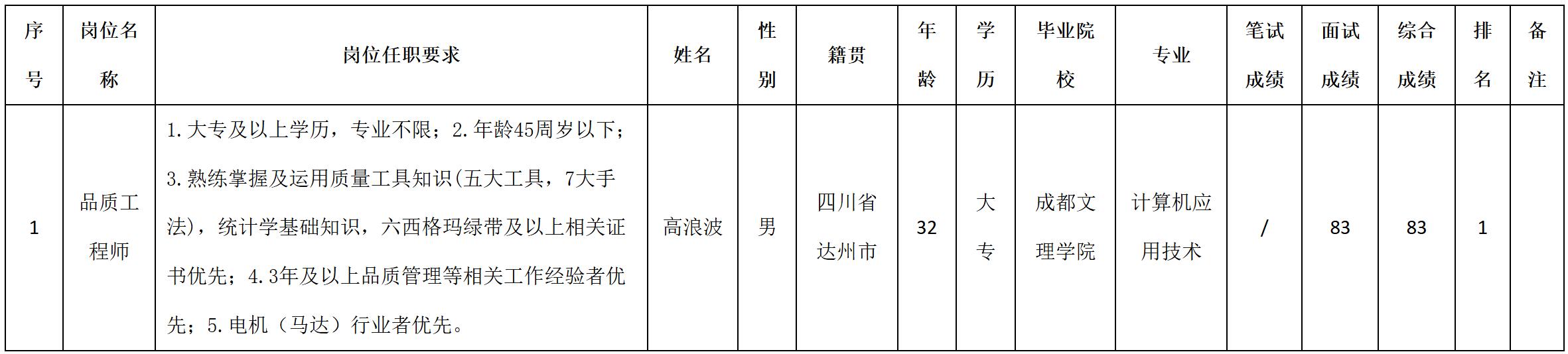 四川安和精密電子電器股份有限公司關于招聘品質工程師測試成績的公示
