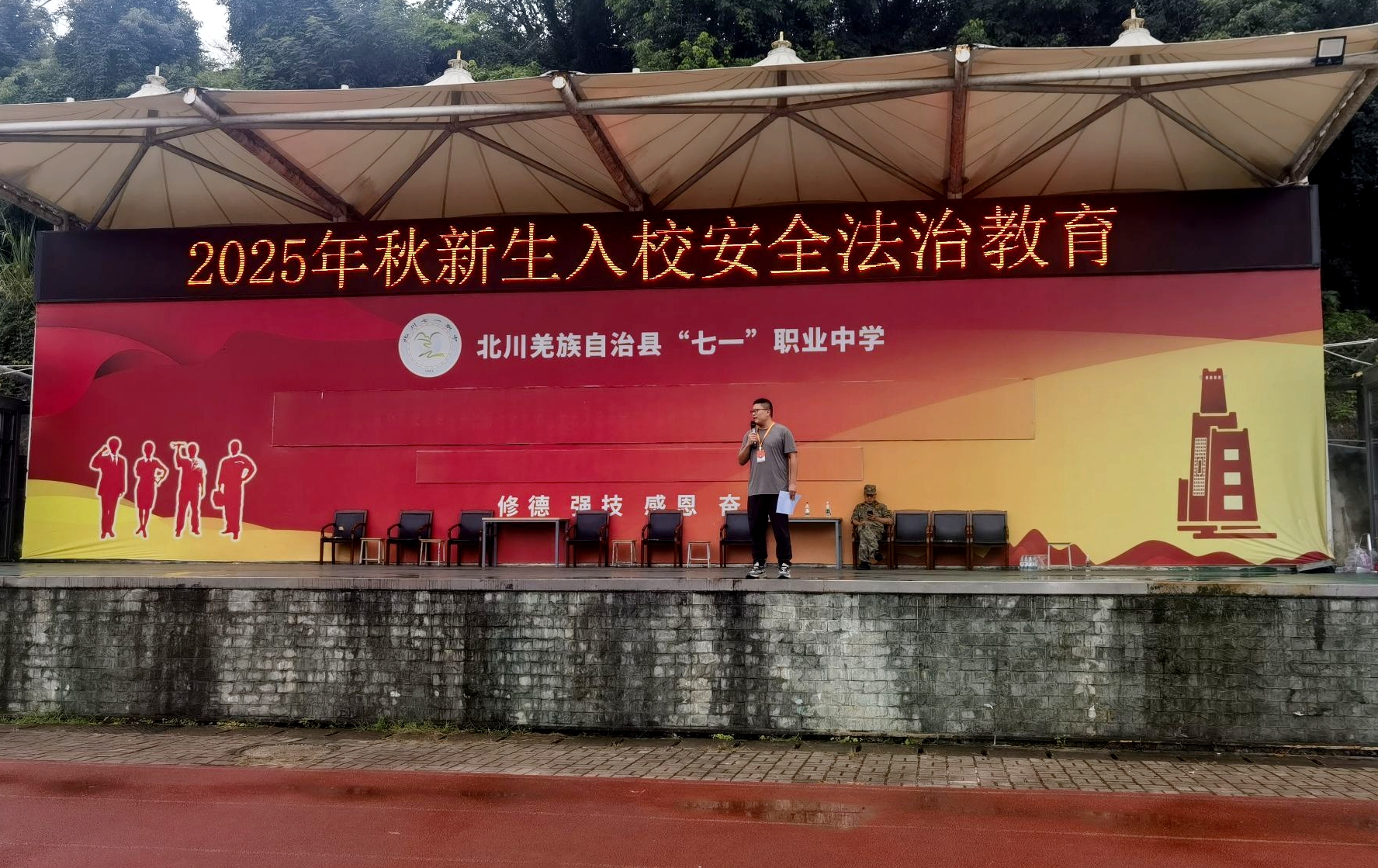 8月25日下午,北川羌族自治縣 “七一” 職業中學2025級全體新生與新生班主任齊聚田徑運動場,開展了2025年秋新生入學安全法治專題教育活動。
