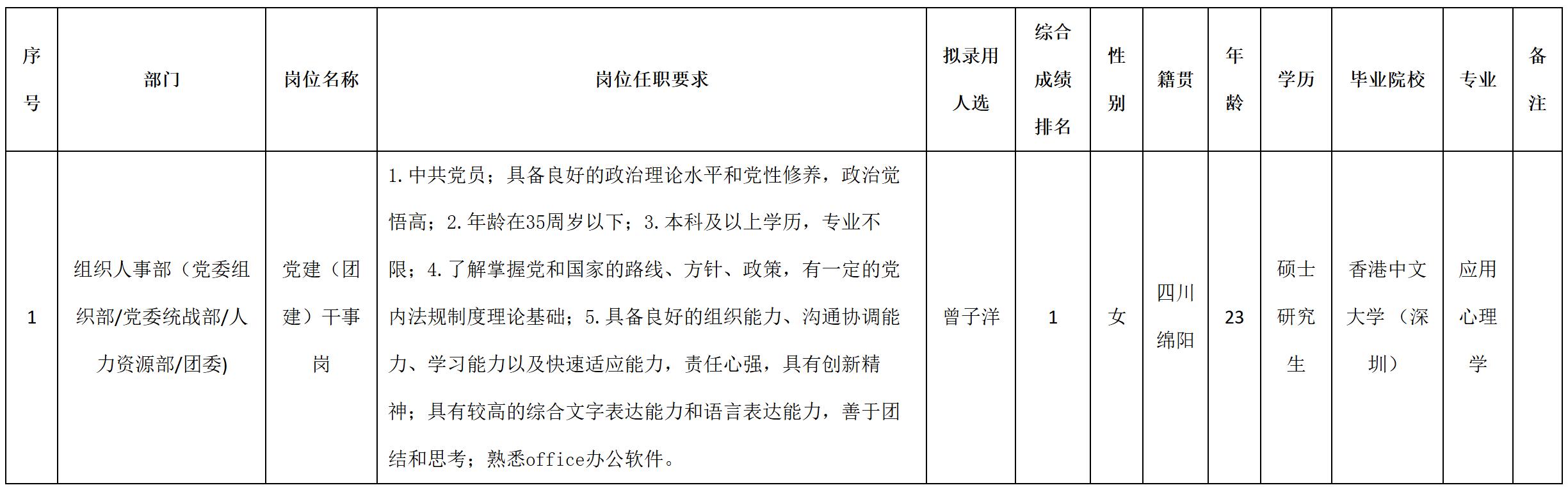 根據四川九洲投資控股集團有限公司發布的招聘公告及招聘相關規定,經筆試、面試、考察、體檢等程序,擬錄用曾子洋同志到四川九洲投資控股集團有限公司工作,現予以公示,具體情況如下:
