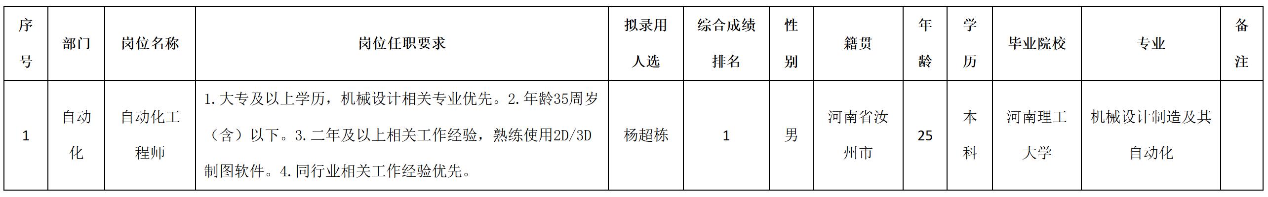 根據四川安和精密電子電器股份有限公司發布的招聘公告及招聘相關規定,經筆試、面試、考察、體檢等程序,擬錄用楊超棟同志到四川安和精密電子電器股份有限公司工作,現予以公示,具體情況如下: