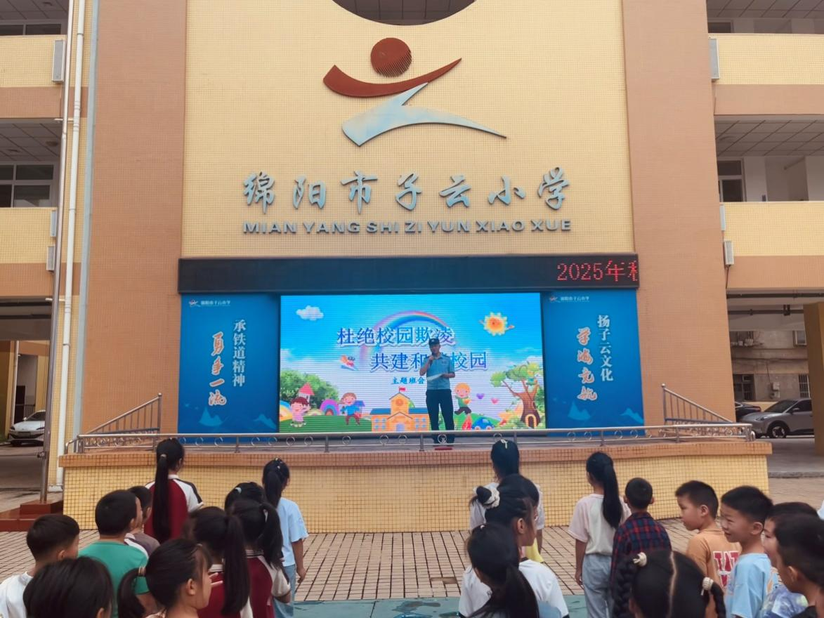 為了進一步加強校園法治安全教育,增強學生自我保護意識,營造和諧健康的成長環境。2025年9月2日,綿陽市子云小學特邀法治副校長、工區派出所民警吳天偉警官到校,為全體師生開展了以防欺凌為主題的普法教育活動。