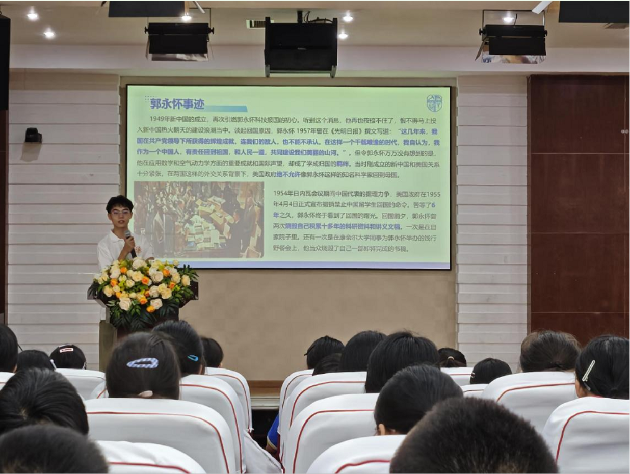演講伊始,印稷銘同學便將老一輩科研工作者的故事娓娓道來。他講述著那些在艱苦卓絕環境中攻堅克難的身影,那些隱姓埋名、無私奉獻的堅守,讓孩子們仿佛看到了戈壁灘上的篝火與實驗室里的燈光。作為團支部書記,他更巧妙地將歷史敘事與共青團對青年的要求相銜接,勉勵大家:“遇到學習困難時,想想當年科學家們在戈壁灘上的堅持,就沒有跨不過的坎。”點明這場演講不僅是對過往的回望,更是新時代青年接力紅色基因的責任傳遞。