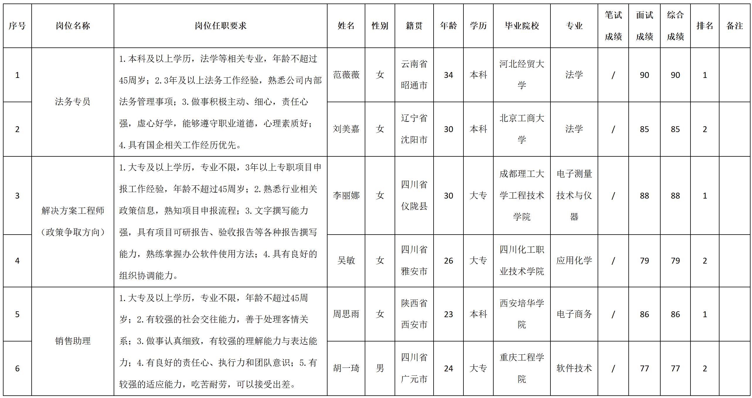 根據四川科瑞軟件有限責任公司發布的招聘公告及招聘相關規定,經筆試、面試等程序,現將筆試(面試)成績予以公示。