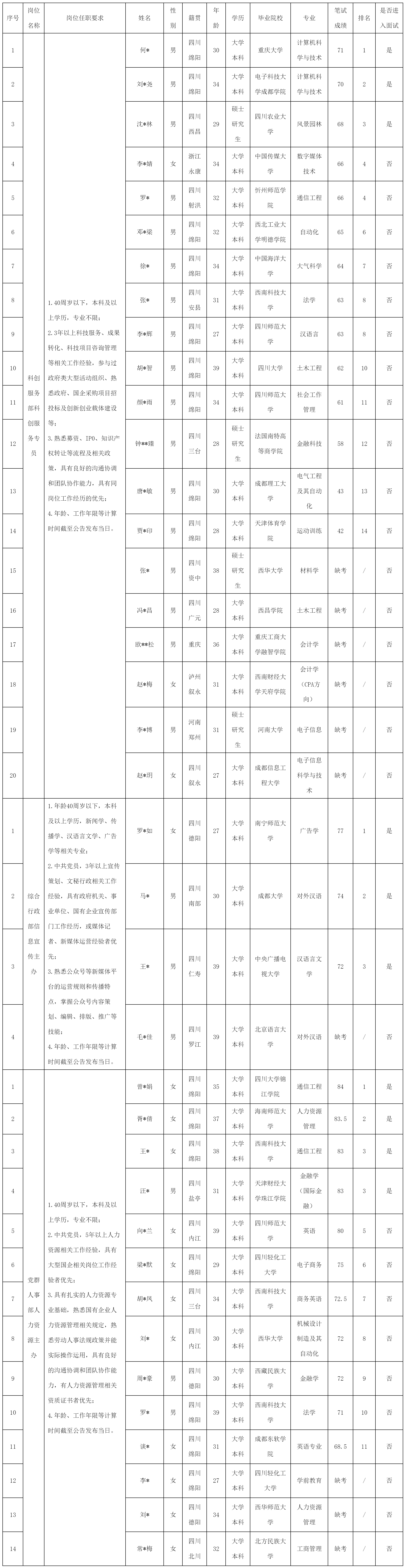根據綿陽科技城科技創新投資有限公司發布的面向社會招聘公司第二批中層管理人員及員工公告及招聘相關規定,現將筆試成績予以公示。