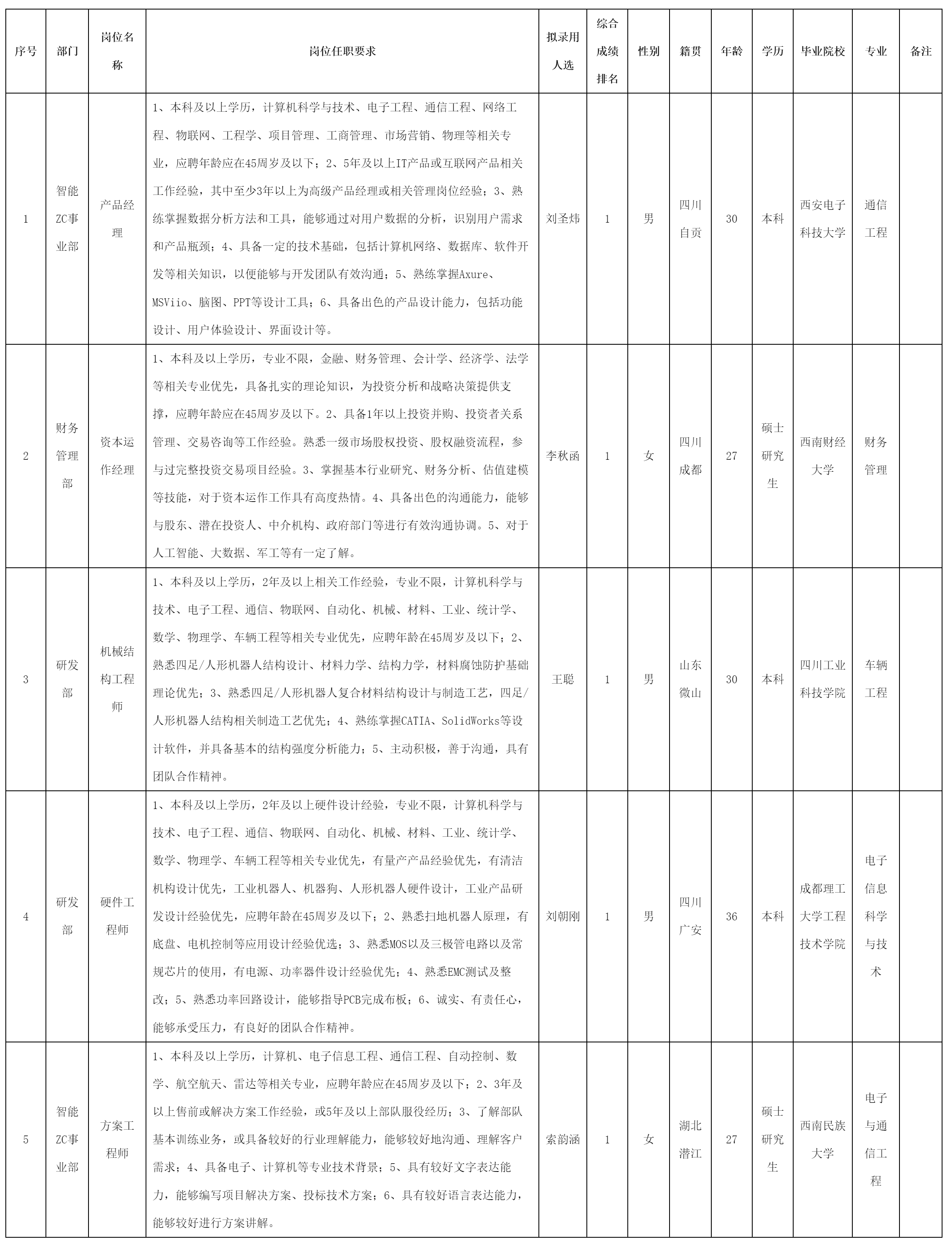 根據四川九洲投資控股集團有限公司軟件與數據智能軍團發布的招聘公告及招聘相關規定,經筆試、面試、考察、體檢等程序,擬錄用劉圣煒等5名同志到四川九洲投資控股集團有限公司軟件與數據智能軍團工作,現予以公示,具體情況如下: