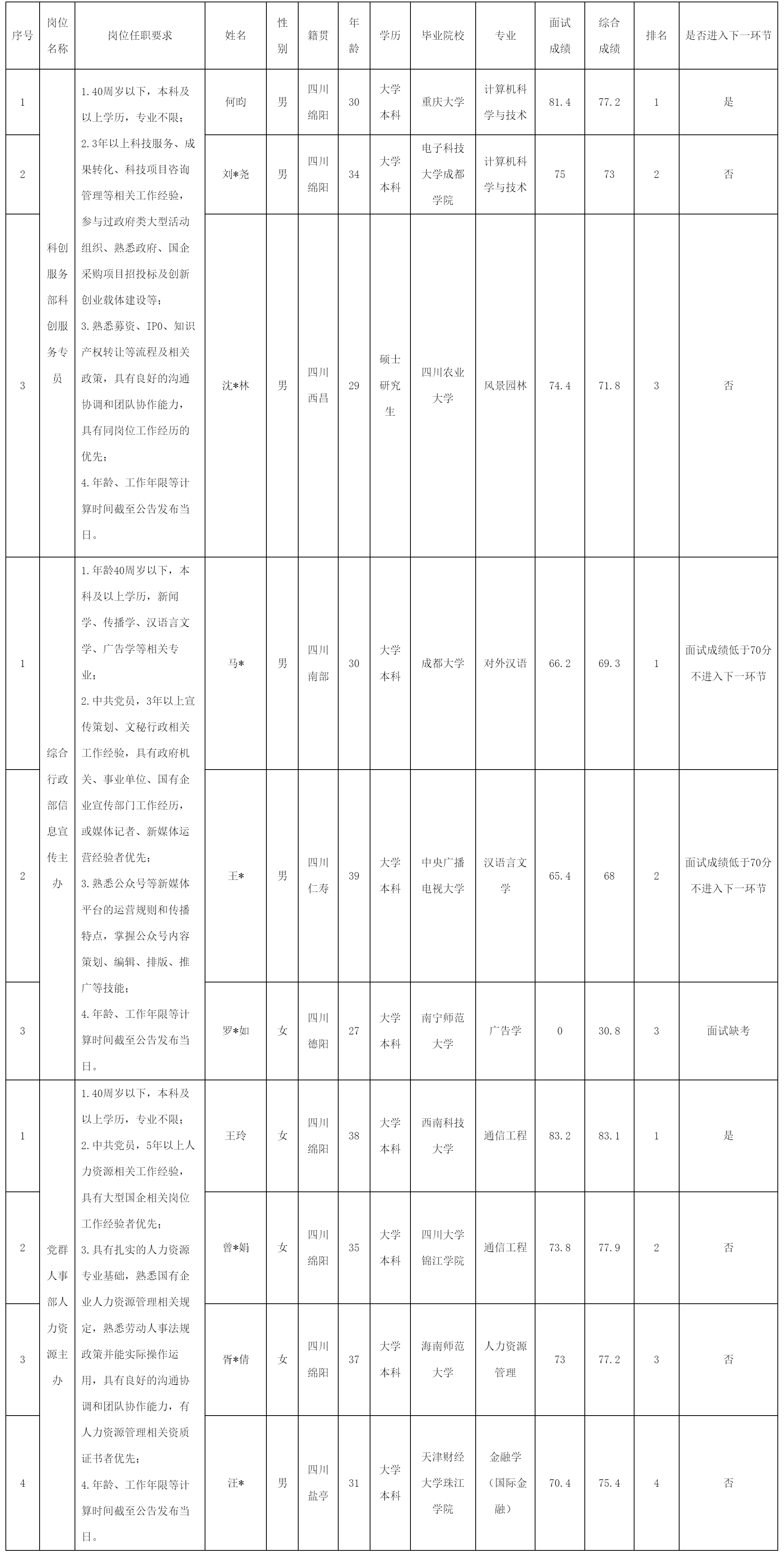 根據綿陽科技城科技創新投資有限公司發布的第二批中層管理人員及員工招聘公告及招聘相關規定,現將綜合成績予以公示。