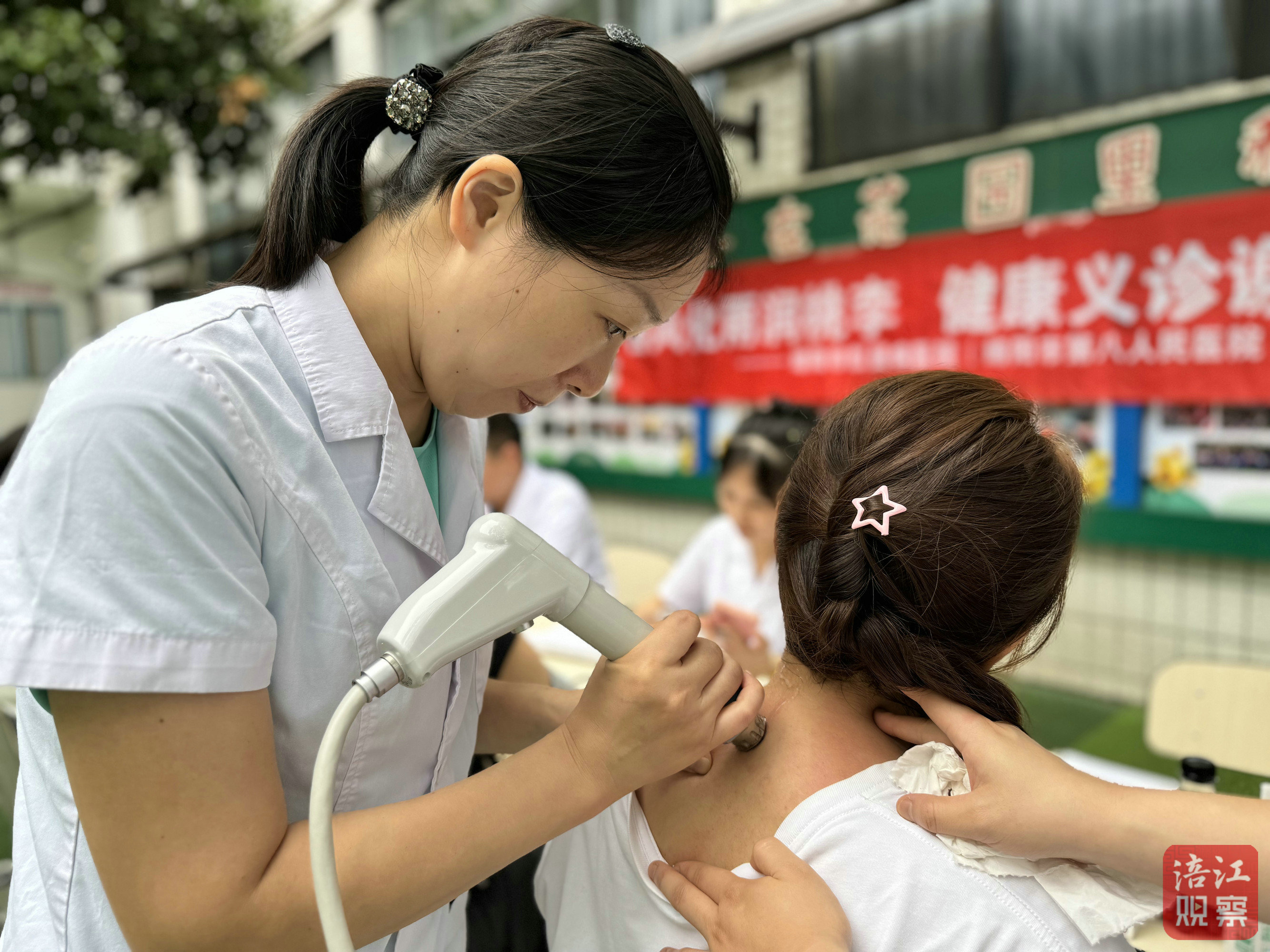 “長期上課,咽喉不適是常事,除了吃緩解咽喉疼痛的藥還可以怎么調理?”“經常批改作業,時間長了不僅容易腰背酸痛,肩頸還僵硬,很難受......”面對前來咨詢的教師,義診醫生楊云耐心地提供專業意見,還利用“獨龍針”“浮針”等特色針灸技術,配合“沖擊波”治療儀深入舒緩老師們的病痛,引來眾多教師參與體驗。