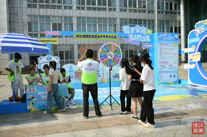當天,記者在綿陽師范學院高新校區圖書館廣場看到,高校新生開學季大禮包發放活動正火熱進行。鮮明的人文特色氛圍、造型獨特的打卡墻、精心布置的迎新裝置,吸引了新生和家長前來打卡、參與活動。
