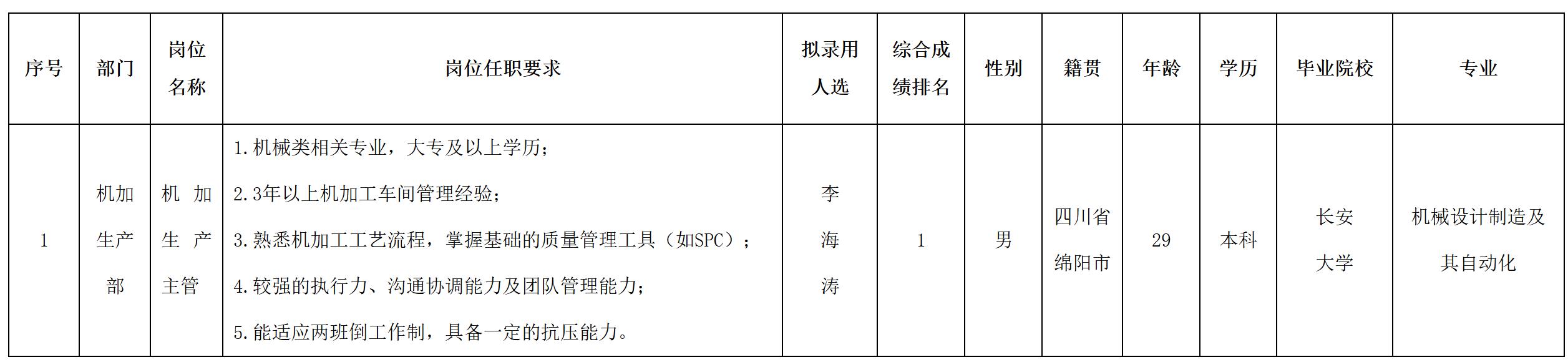 根據四川波鴻實業有限公司發布的招聘公告及招聘相關規定,經面試、體檢等程序,擬錄用李海濤同志到威斯卡特(綿陽)汽車零部件制造有限公司工作,現予以公示,具體情況如下: