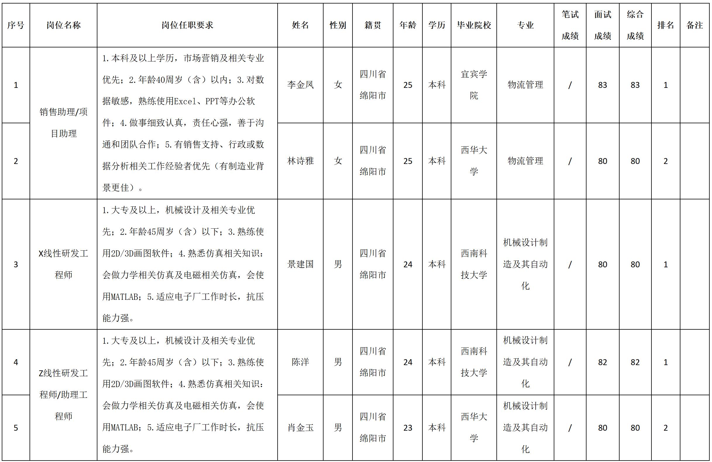 根據(jù)四川安和精密電子電器股份有限公司發(fā)布的招聘公告及招聘相關規(guī)定,經(jīng)筆試、面試等程序,現(xiàn)將筆試(面試)成績予以公示。