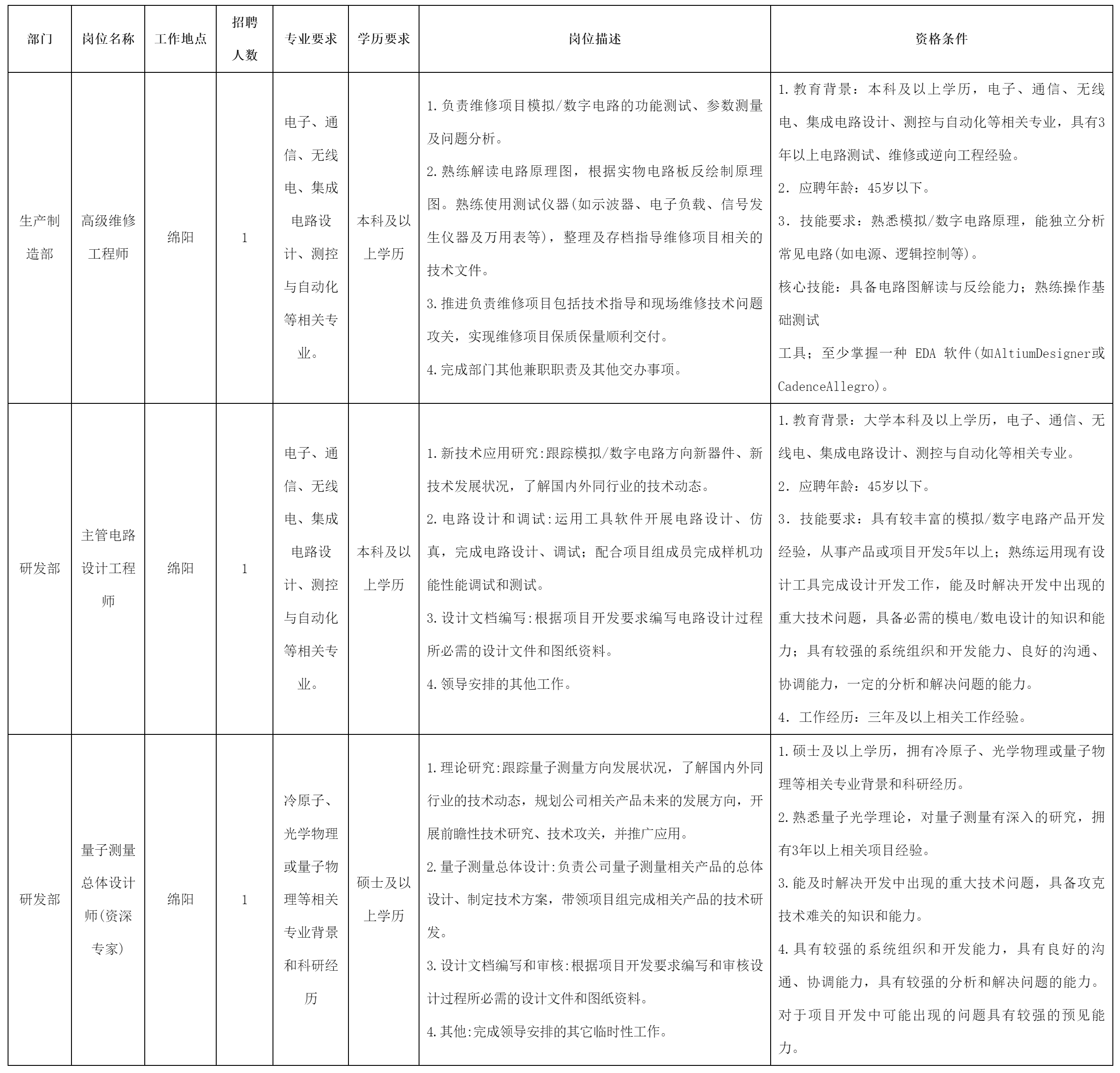 四川長虹電子科技有限公司(國營第七八〇廠)始建于1958年,是國家“一五”期間的156個(gè)重點(diǎn)項(xiàng)目之一,是我國第一個(gè)機(jī)載火控雷達(dá)科研生產(chǎn)基地,位于綿陽市經(jīng)濟(jì)技術(shù)開發(fā)區(qū)。公司注冊(cè)資本1.7億元人民幣,為國有獨(dú)資企業(yè)。公司主要從事重力測量、光電探測和光電告警領(lǐng)域產(chǎn)品研發(fā)和生產(chǎn)。因業(yè)務(wù)發(fā)展需要,現(xiàn)誠聘英才,招聘崗位及要求如下: