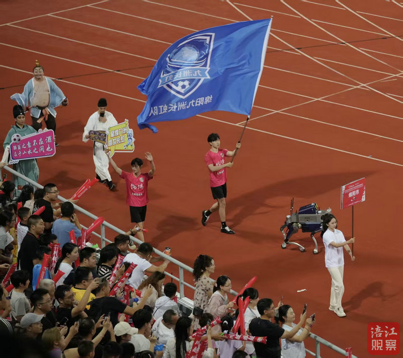 入場完畢后,綿陽特色方隊再次呼喊“星耀九洲 盛世長虹”口號,并配合各自角色的標志性動作定格。這一刻,整個球場仿佛被點燃了一般,氣氛熱烈到了極點。