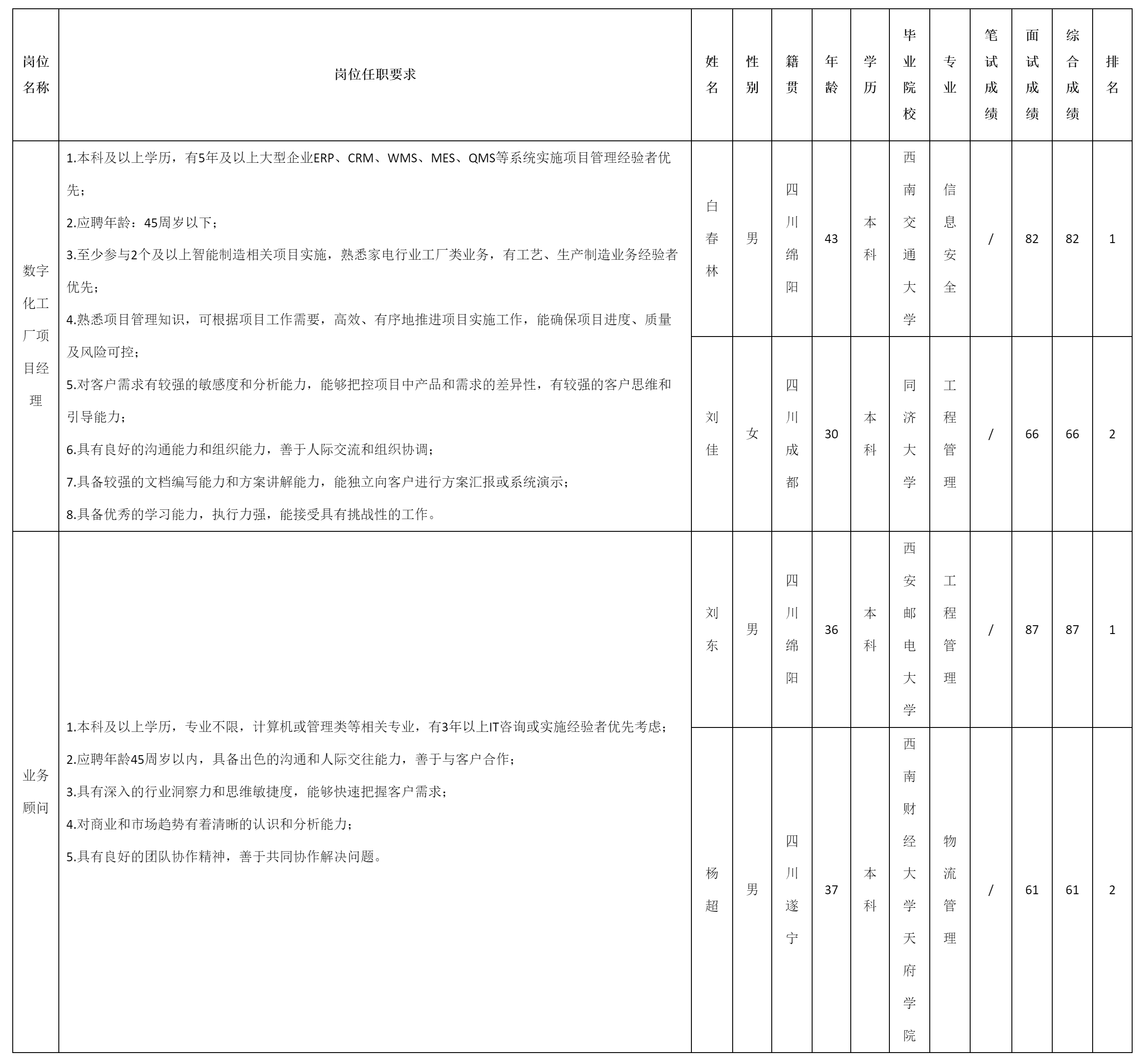 根據四川虹信軟件股份有限公司發布的招聘公告及招聘相關規定,經面試等程序,現將面試成績予以公示。