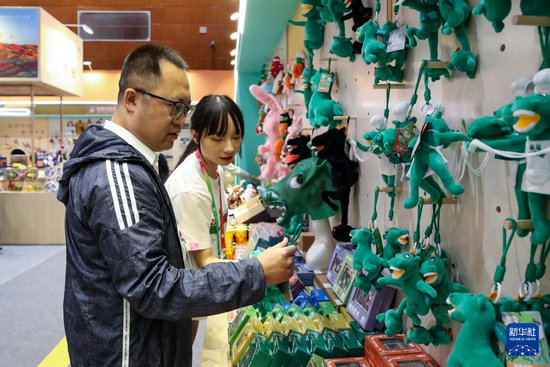 9月21日,與會嘉賓在第八屆絲綢之路(敦煌)國際文化博覽會上選購非遺文創產品。