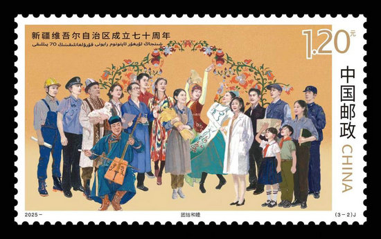 《新疆維吾爾自治區成立七十周年》紀念郵票。(新疆郵政供圖)