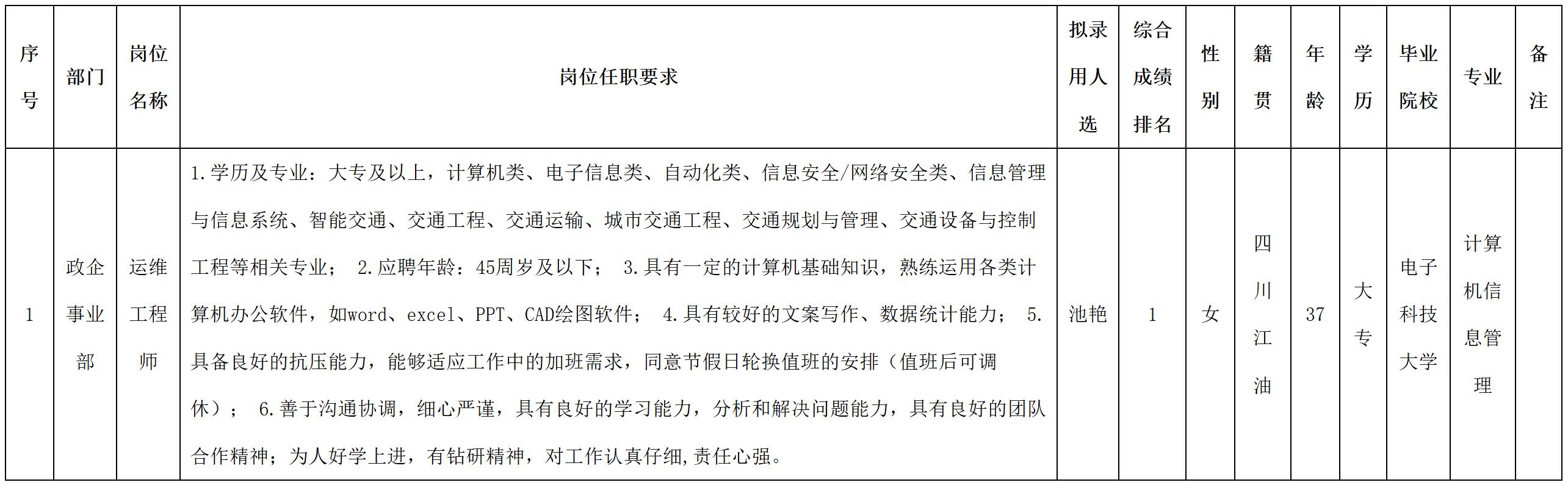 根據四川九洲投資控股集團有限公司軟件與數據智能軍團發布的招聘公告及招聘相關規定,經筆試、面試、考察、體檢等程序,擬錄用池艷同志到四川九洲投資控股集團有限公司軟件與數據智能軍團工作,現予以公示,具體情況如下:
