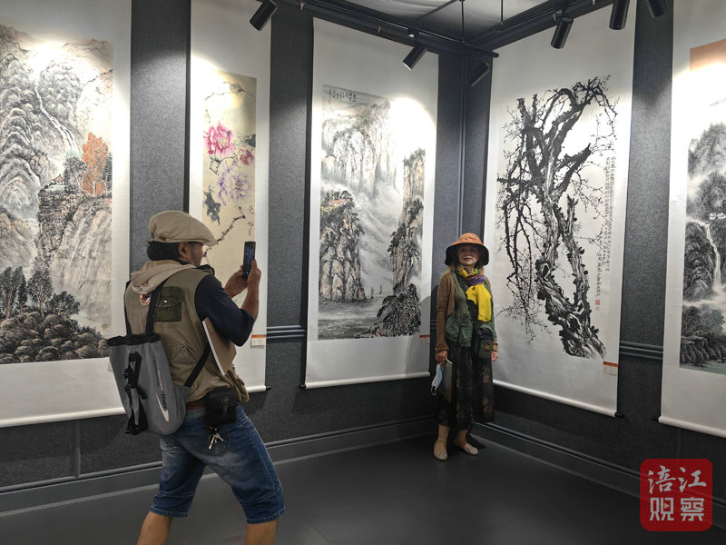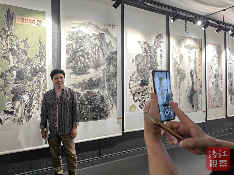 展覽現場,時有參觀者拿出手機在各自喜歡的作品前合影留念,有的與參展作者進行藝術交流,畫家吳映強應邀對展出作品的構思、技法、內容表達等進行現場點評,吸引了大家圍觀。