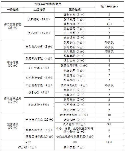 按照2024年度市本級部門整體支出績效評價體系及計分標準,我單位較好的完成了本年度目標任務,整體績效評價結果為 “優秀”。根據本部門收支情況、預算執行情況、部門履職效益分析及整體績效管理情況綜合自評,剔除本部門不涉及指標,折算前得分為83.91分,折算后實際得分為95.35,自評等次為:優秀。