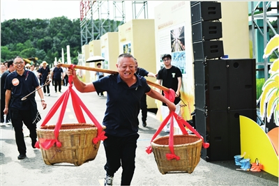 除了運動會,會前的文藝展演和農家走秀環節,圍繞豐收、三農、鄉愁為主題,各村書記作為領隊,帶領村民展示鄉村生活服飾和農產品特色。
