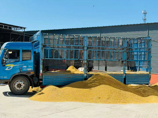 紅揚(yáng)有機(jī)種植農(nóng)民專業(yè)合作社社員們正在將收獲的稻谷卸車。新華社記者孫曉宇 攝