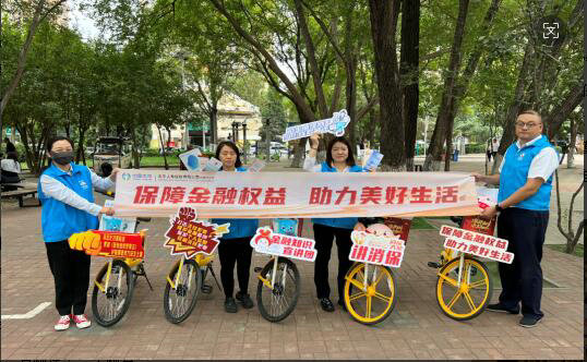 天津分公司的騎行宣傳小隊從海光寺商圈出發,車筐里擺著太平吉象和“消保團子”玩偶,懸掛著醒目標語,一路騎行至街邊公園、公交站、學校等人流密集區,向市民發放折頁、講解知識。“共享單車+金融宣傳”,既環保又親民,真正讓知識“騎”進百姓心里。