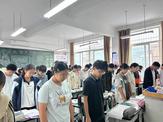 上午10時整,當綿陽市防空警報準時響起,全校各班級瞬間肅靜。全體學生應聲起立,垂首默哀十分鐘。教室里莊重肅穆,唯有窗外的警報聲叩擊心靈,寄托著師生對革命先烈的深切哀思與崇高敬意。