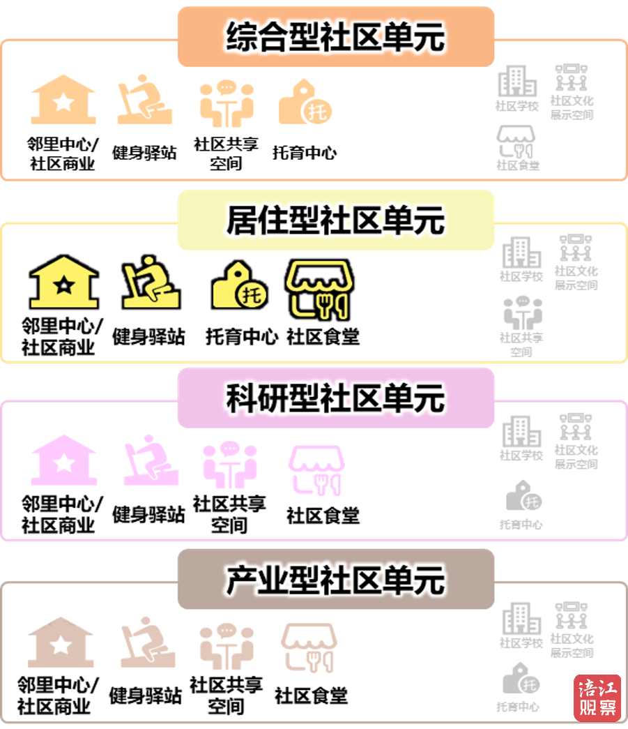 同時又將社區級單元分為了居住型、綜合性、科研型、產業型四類,為后期差異性多樣化配制公共服務設施,提供了基礎,確保城市管理既全面又精細。