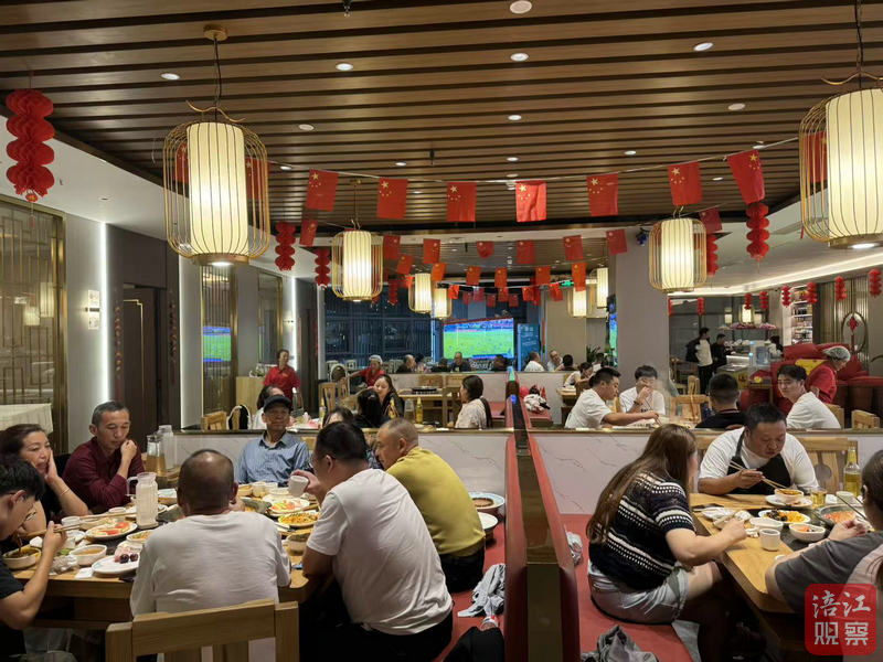 正在點菜的李先生說:“我們原計劃是去別家吃飯,路過時看到能邊看球邊吃火鍋,立馬被吸引了。這種‘觀賽+餐飲’的模式非常新穎,氛圍感十足,感覺周圍坐的都是同道球迷!”比賽尚未正式開始,熱烈的氛圍已然升溫。