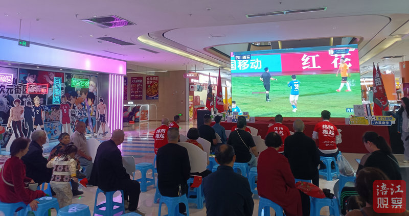在江油市圣名購物廣場負一樓大潤發超市的顧客休息區,提前設置好的大屏幕和觀看席吸引了眾多消費者和球迷駐足,一同觀看這場比賽實況轉播,為綿陽健兒加油。現場裝飾著足球模型、綿陽隊隊旗和加油標語,烘托出熱烈的觀賽氛圍。