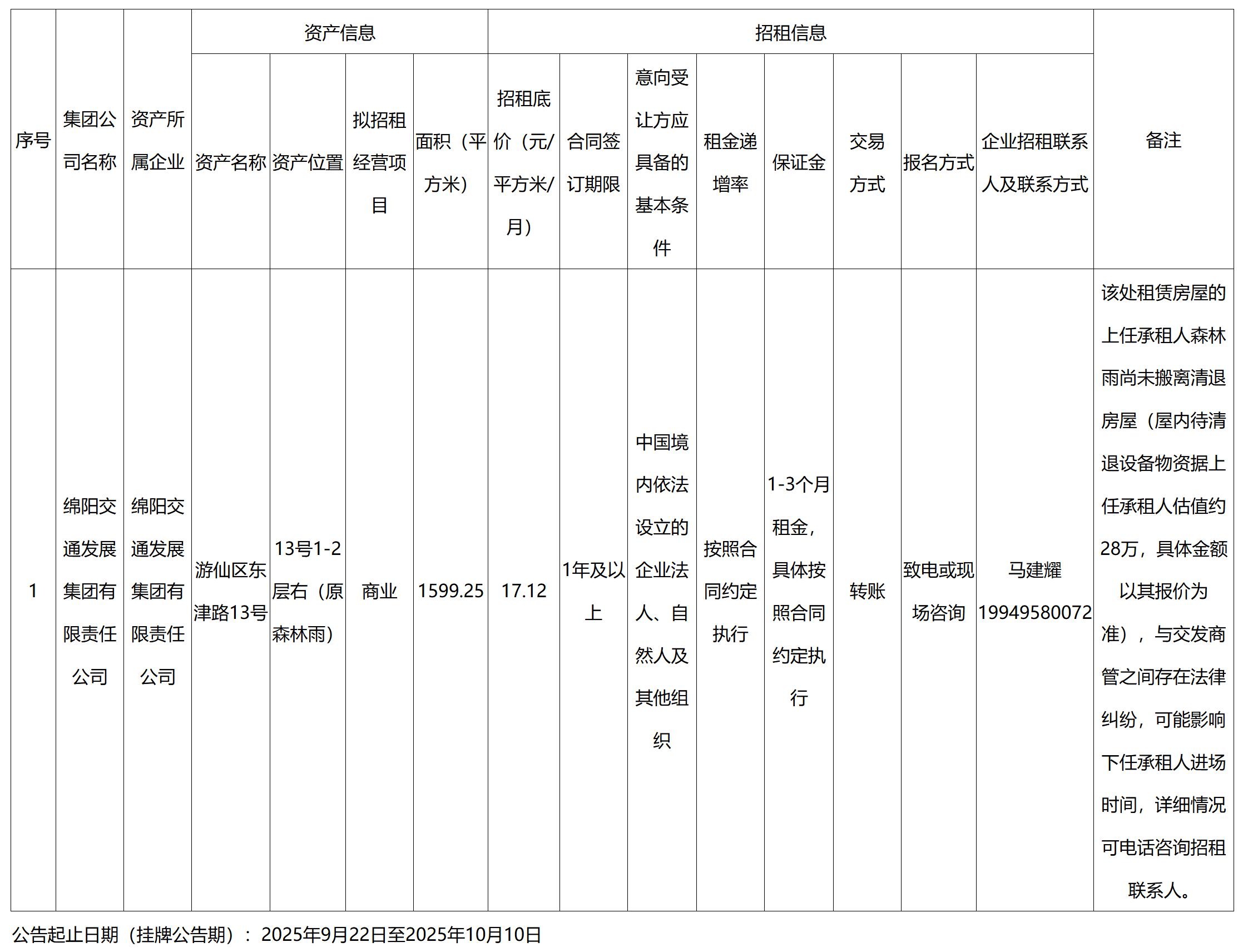 綿陽交發實業有限責任公司游仙區東津路13號資產招租公告