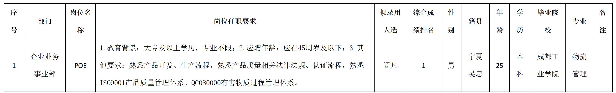根據四川九州電子科技股份有限公司發布的招聘公告及招聘相關規定,經筆試、面試、考察、體檢等程序,擬錄用閻凡同志到四川九州電子科技股份有限公司工作,現予以公示,具體情況如下: