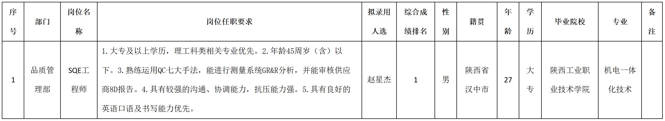 根據四川安和精密電子電器股份有限公司發布的招聘公告及招聘相關規定,經測試、考察、體檢等程序,擬錄用趙星杰同志到四川安和精密電子電器股份有限公司工作,現予以公示,具體情況如下:
