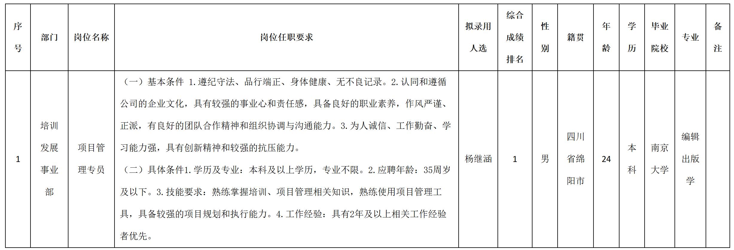 根據四川九洲教育投資管理有限公司發布的招聘公告及招聘相關規定,經測試、考察、體檢等程序,擬錄用楊繼涵同志到四川九洲教育投資管理有限公司工作,現予以公示,具體情況如下: