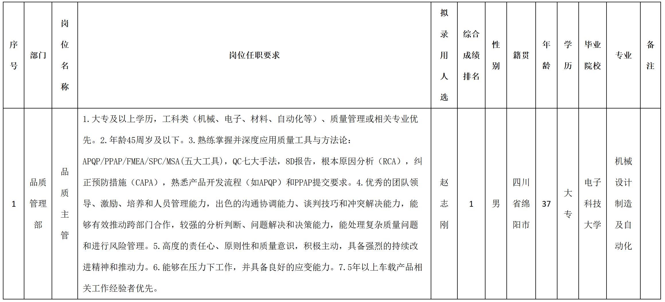 根據(jù)四川安和精密電子電器股份有限公司發(fā)布的招聘公告及招聘相關規(guī)定,經(jīng)測試、考察、體檢等程序,擬錄用趙志剛同志到四川安和精密電子電器股份有限公司工作,現(xiàn)予以公示,具體情況如下: