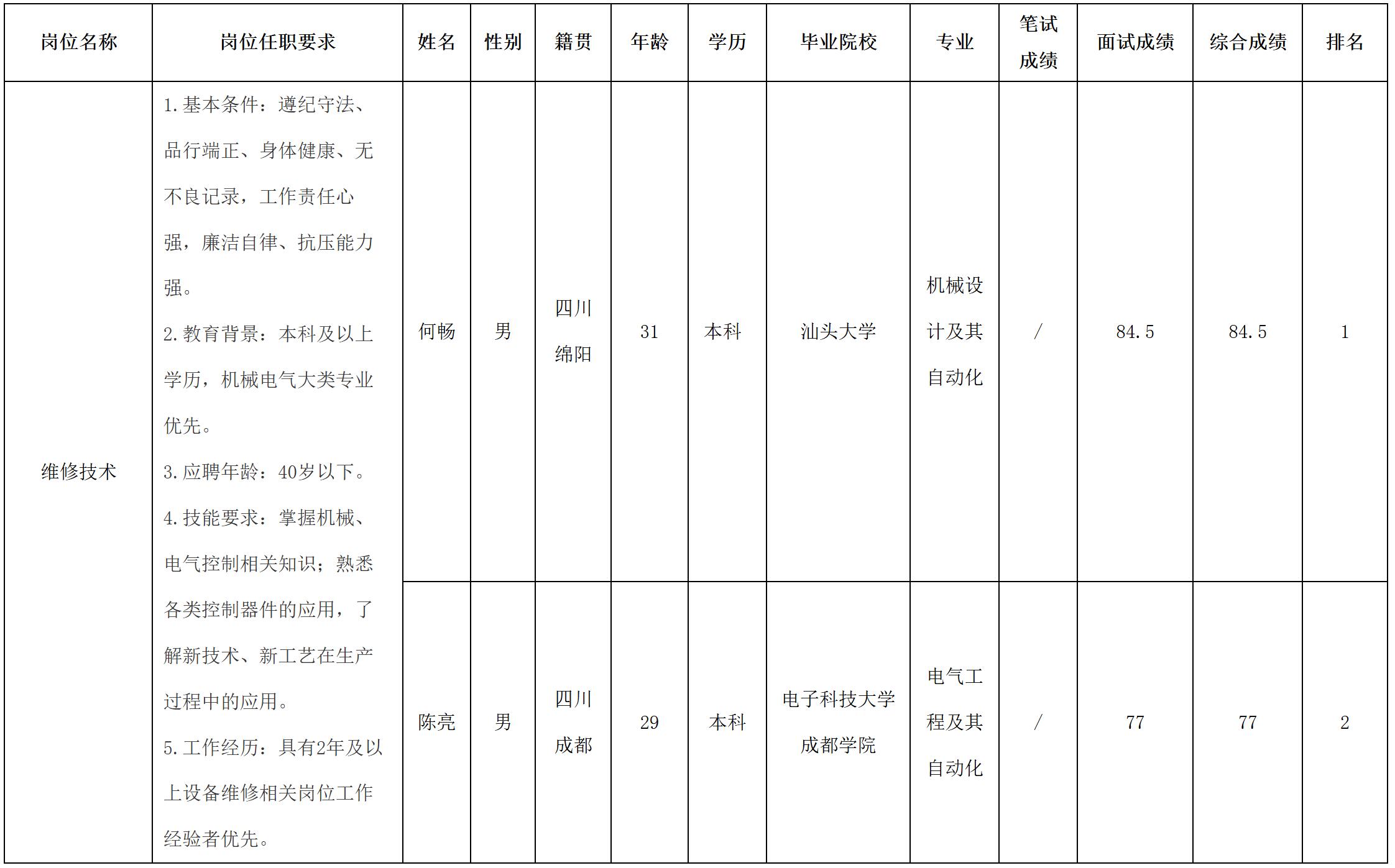 根據四川長虹空調有限公司發布的招聘公告及招聘相關規定,經面試等程序,現將面試成績予以公示。