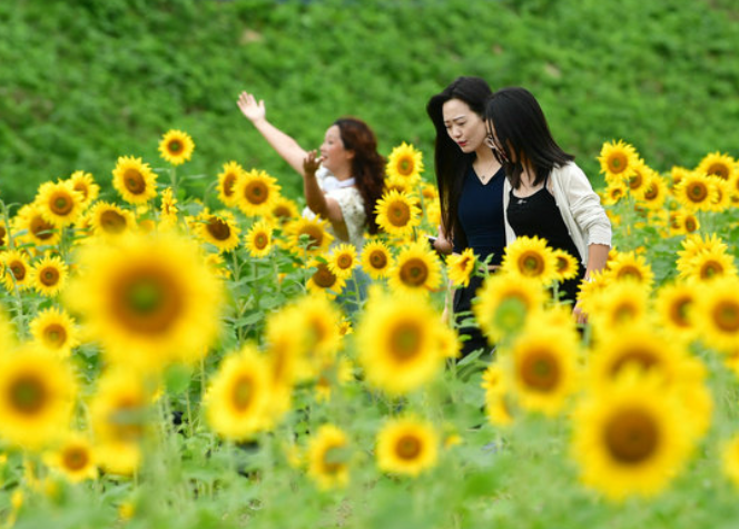 金秋十月,游仙區石馬鎮的向日葵花田進入盛花期,連片向日葵生機盎然。[
