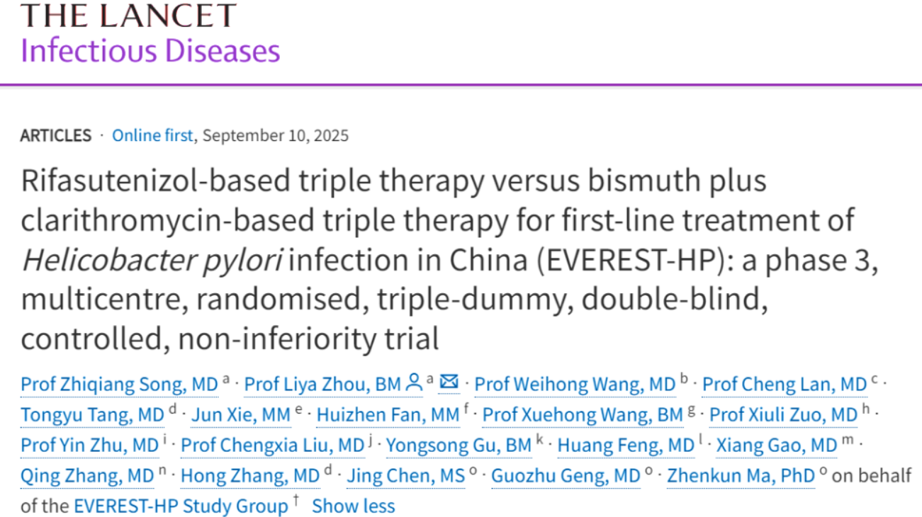 北京大學第三醫院消化科周麗雅/宋志強教授團隊帶領全國40家醫療機構消化疾病診療中心研究發現,含利福特尼唑的三聯方案,讓幽門螺桿菌治療有望重新回歸更簡便的三聯方案時代,為全球幽門螺桿菌感染者帶來了全新的治療選擇。相關成果日前于《柳葉刀-感染病學》在線發表。[