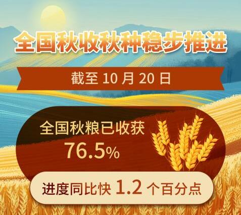 目前,全國秋收秋種正穩(wěn)步推進。截至10月20日,全國秋糧已收獲76.5%,進度同比快1.2個百分點。 這是記者21日從農(nóng)業(yè)農(nóng)村部了解到的消息。[